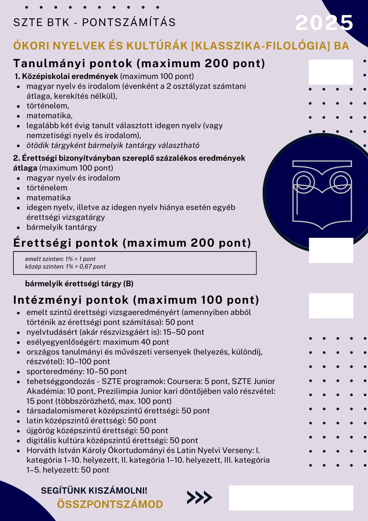 Jelöld meg első helyen az SZTE BTK ókori nyelvek és kultúrák alapszakját! Jelentkezésedhez nem szükséges nyelvismeret, a képzés része a két klasszikus nyelv, a latin és az ógörög oktatása emelt óraszámban.