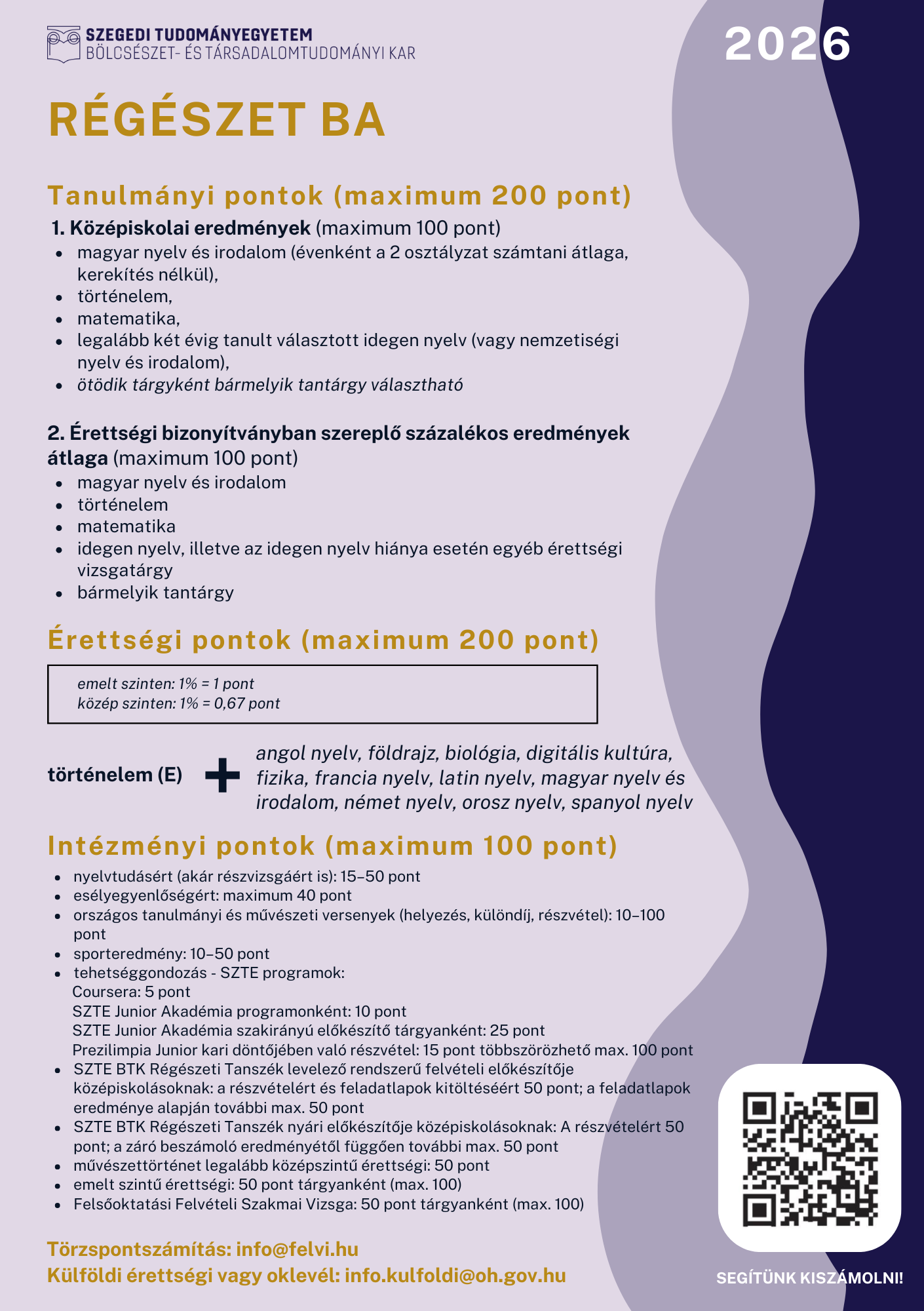 - Mert kiváló szakemberektől tanulhatsz: nemcsak nagy tapasztalatú szegedi oktatóktól, de az ország számos kutatóhelyéről és legjobb múzeumaiból érkezett régésztől. - Mert a szegedi régészképzés országos hírű abban a vonatkozásban is, hogy nem pusztán elméleti oktatást nyújt, de nálunk megtanítanak a régészeti terepmunka, ásatás stb. csínjára-bínjára. - Mert a tanszék „emberléptékű”. Minden egyes hallgatónkra elegendő idő jut, mindenki ismer mindenkit, nem mellesleg remek, összetartó a közösség, ahova jó tartozni. - Mert tanszékünk munkatársai az egyetemi oktatás mellett számos kutatási programban vesznek részt, melybe a hallgatóink is aktívan bekapcsolódnak. - Mert hallgatóink az utóbbi években sorra nyerik az egyetemek közötti tanulmányi versenyeket, megelőzve a pesti, pécsi és miskolci tanszékeket. - Mert nálunk lehetőség van a továbblépésre. A szegedi egyetem régészeti képzése háromszintű oktatási struktúrával rendelkezik, vagyis BA (Bachelor), MA (Master) és doktori képzést (PhD) is biztosít hallgatóinak. - Mert tanszékünk „Partiscon” diákköre egész évben gondoskodik arról, hogy a tanulás mellett ne legyen időtök unatkozni (elsősök bemutatkozó estje, Mikulás buli, farsang, főzőverseny, kirándulás).