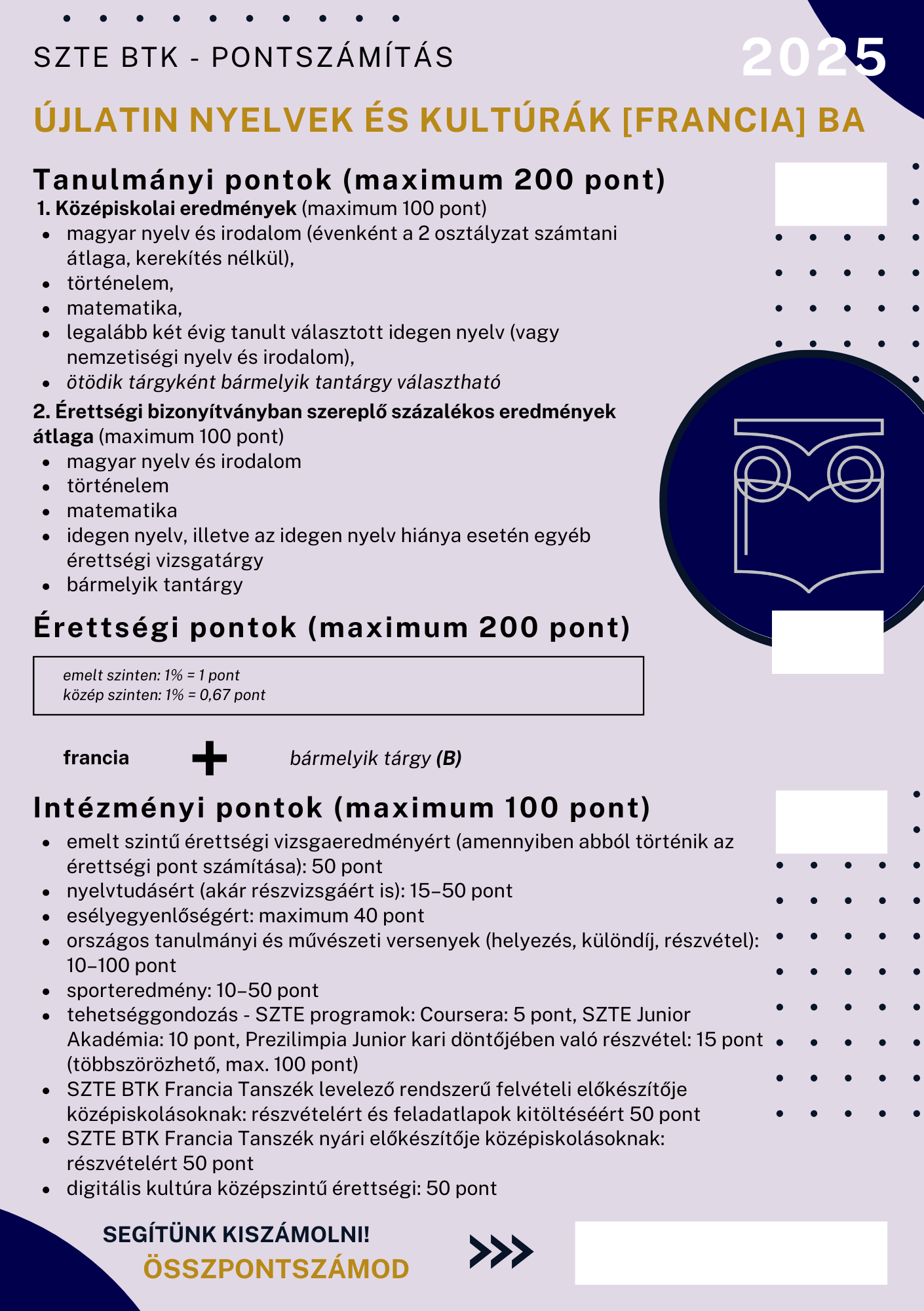 Jelöld meg első helyen az SZTE BTK újlatin nyelvek és kultúrák alapszak francia szakirányát a jelentkezés során! Tegyél francia nyelvből legalább közép szintű érettségit!